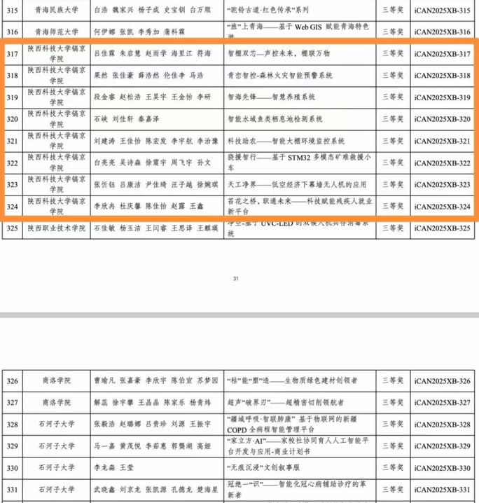 第十九届iCAN大学生创新创业大赛西北赛区决赛近日圆满收官,来自西安交通大学、西北工业大学、兰州大学、西安电子科技大学、青海大学、石河子大学、宁夏大学等86所高校的1310支队伍齐聚一堂,展开激烈角逐。陕西科技大学镐京学院在本届比赛中表现抢眼,斩获一等奖1项、二等奖5项、三等奖8项的优异成绩。我校凭借出色的组织工作荣获“优秀组织奖”,计算机学院朱赖红、杨晨两名教师获评“优秀指导教师”称号。更令人振奋的是,计算机学院计算机2208班杨家辉团队凭借优异的表现成功晋级全国总决赛,实现了我院参赛历史上的重要突破。
