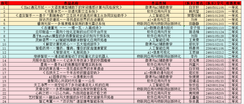 经过校赛现场答辩等环节,最终评选出一等奖5项、二等奖8项、三等奖11项。获奖作品充分展示了我校学生扎实的计算机专业功底、敏锐的创新思维和出色的实践能力。