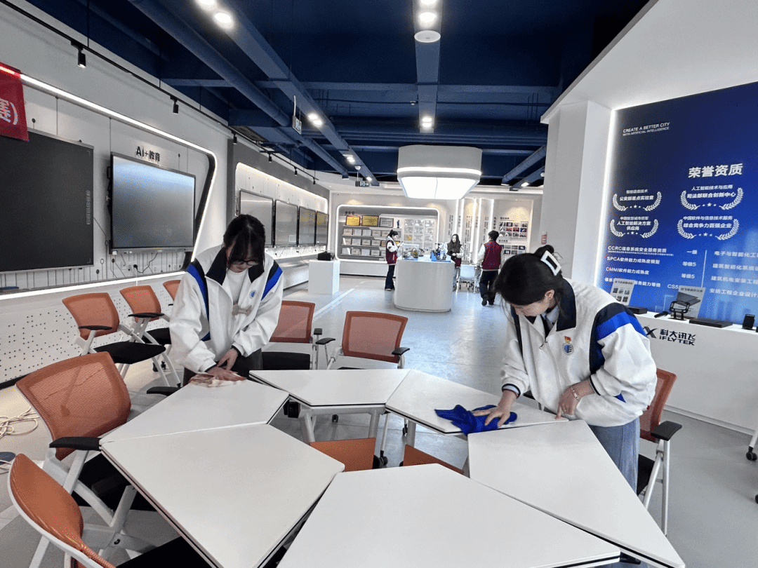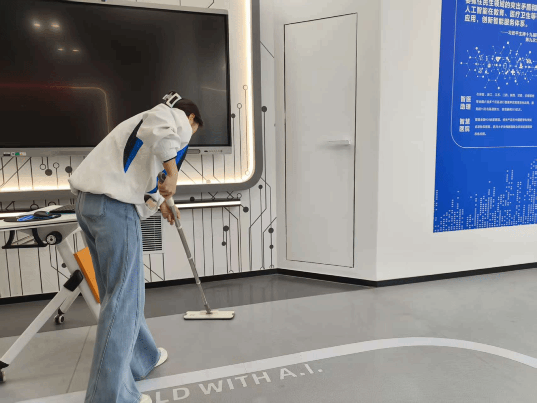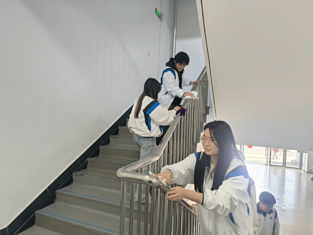 活动当天,学生党员们热情高涨、分工协作,全身心投入主题党日实践,聚焦校园重点区域开展清洁整治,用责任与担当擦亮文明校园底色。在教学楼区域,党员同志们有条不紊开展清洁工作,专注擦拭扶梯及各类公共设施,细致清理灰尘污渍、不放过任何卫生死角,让教学楼公共区域焕然一新;同时深入AI灵犀智创中心,认真清扫地面、整理并细致归置各类杂物,为师生营造整洁有序的科研学习环境。