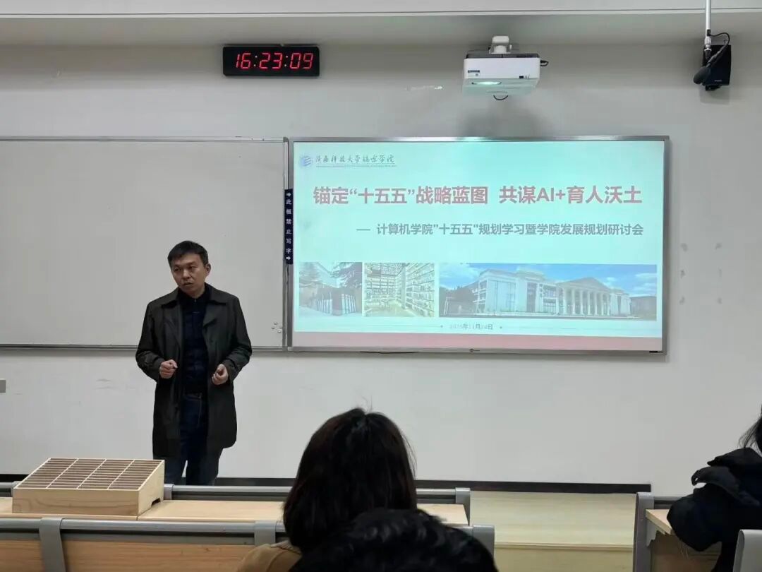 会上,院长刘威带领全体教职工学习学校“十五五”规划纲要及编制方案,重点解读“立足陕西、服务区域,建设特色鲜明高水平应用型大学”的办学定位与“质量立校、人才强校、特色兴校”战略,明确计算机学院作为学校人工智能产业发展核心载体,需紧扣“新工科”导向融入规划体系,在专业集群、产教融合、师资优化上突破,为学校转设评估与高质量发展赋能。