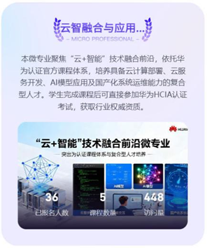 为实现人才培养与产业需求的“无缝对接”,计算机学院前瞻性地开设了“云智融合与应用”微专业。该微专业课程体系深度对标全球ICT行业权威的华为HCIA认证课程,将华为在信创、云计算和人工智能等领域的最新技术、实践案例及职业素养要求融入教学大纲。课程不仅涵盖云与AI开发等核心理论,更强调通过项目式学习解决复杂的ICT行业工程问题,为学生构建了系统化、前沿性的知识与技能栈。