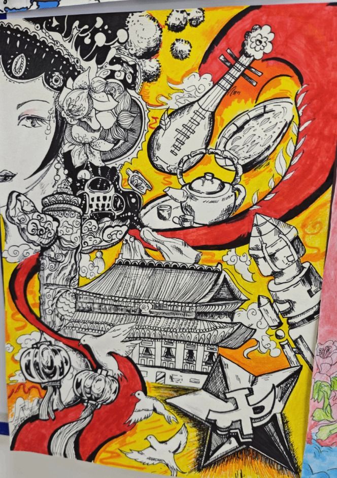“画笔绘中华” 新生绘画作品比赛中,2025 级新生们充分发挥创意与才华,以国庆为主题,用国画、油画、水彩画、版画、漫画等多种形式,尽情描绘祖国的壮丽山河、民族团结的美好画卷、时代变迁的巨大成就以及社会和谐的温馨场景。每一幅都饱含着新生们对祖国的热爱与祝福,传递出浓厚的爱国情怀与坚定的文化自信。