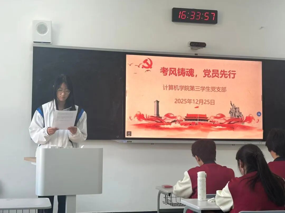 为强化党员诚信应考意识,筑牢党性修养根基,进一步端正考风、严肃考纪,充分发挥学生党员先锋模范作用,2025年12月25日,计算机学院第三学生党支部在406教室开展“考风铸魂,党员先行”主题党日活动。支部书记苏晶主持,全体学生党员与41期积极分子参加。
